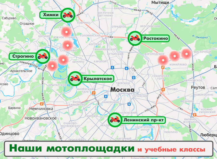 Теоретический курс + практический курс 18 часов вождения. Обучение проводится как на открытых (весна-осень), так и на закрытых (зима) мотоплощадках. Таким образом мы осуществляем обучение в мотошколе и зимой. Ориентировочный срок обучения 5-8 недель. После окончания обучения осуществляем сопровождение на экзамены в ГИБДД "Строгино".